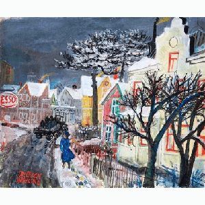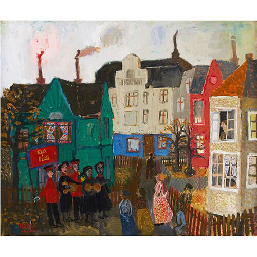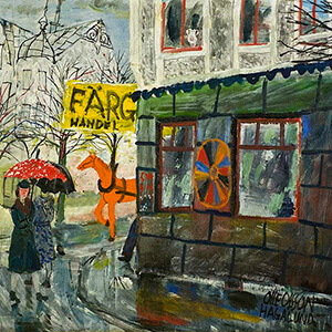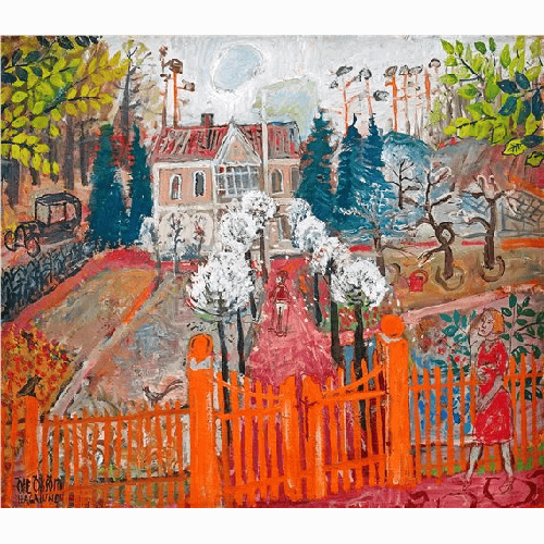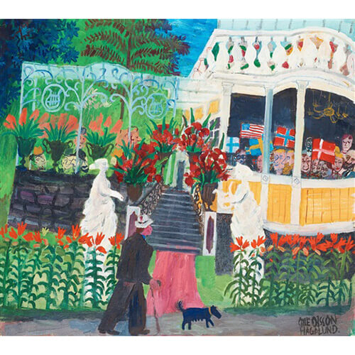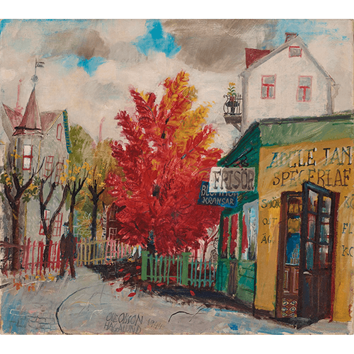 Olle Olsson “Hagalund” (1904–1972) förknippas med naivistiskt färgglada skildringar av den stockholmska förorten Hagalund: trähus, gator och människor i ett varmt, humoristiskt ljus. Med platta färgfält, tydliga konturer och en vardagsnära poesi gav han det enkla livet monumental närvaro. Hans måleri har blivit en folkkär påminnelse om stadens försvunna miljöer och en hyllning till det nära och igenkännbara.